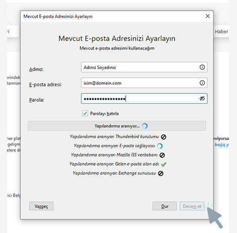 3. Thunderbird Mozilla ISS Veritabanı ile ek bir ayarlama yapmanıza gerek kalmadan otomatik olarak mail kurulum ayarlarını tamamlayacaktır.
